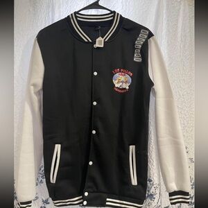 Stay stylish with the varsity jacket from the TV Show Breaking Bad. Featuring a classic black and white design, this jacket is perfect for casual outings. Show off your love for the iconic brand with this comfortable and trendy piece. Authentic from the store in New Mexico, Santa Fe