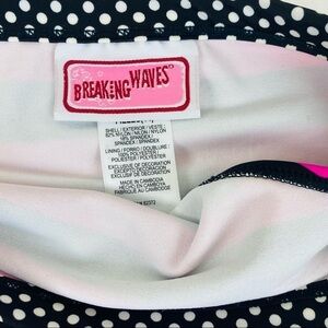 This is a striped black and pink bikini with rhinestone peace sign from breaking waves