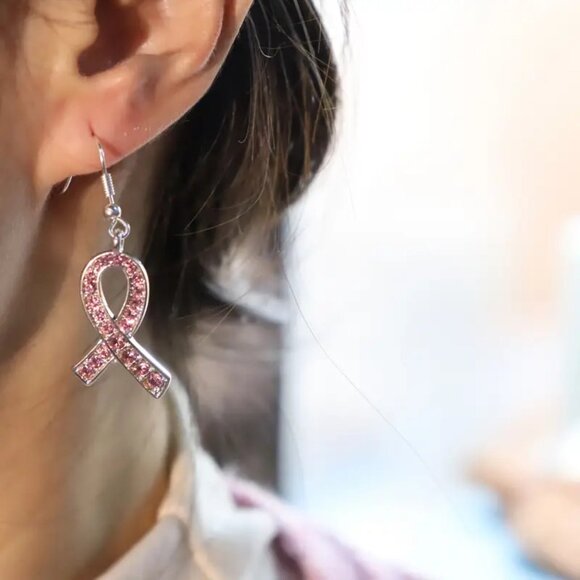 Breast Cancer Awareness Dangle Earrings Pink Rhinestones Silver Tone 1 1/4 Inch