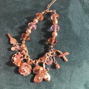 Breast Cancer Bracelet, many charms, adjustable length, with original box