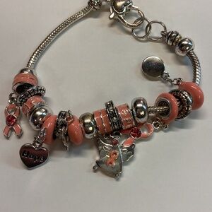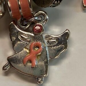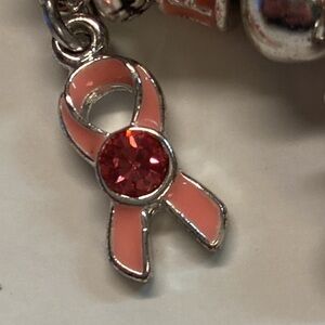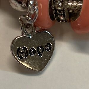 Silver bracelet with charms: hope, breast cancer insignia charm, many circle pendants. The contrasting enamel pendants are are peachy pink and not a true pink. Costume jewelry. Preowned