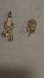 The image shows two pins. The pin on the left is shaped like a candle with a pink ribbon wrapped around it, featuring gold trim. The pin on the right is shaped like a gold rose with two leaves and a stem. Search results indicate the rose pin is vintage.