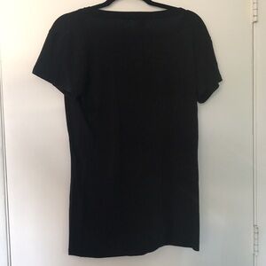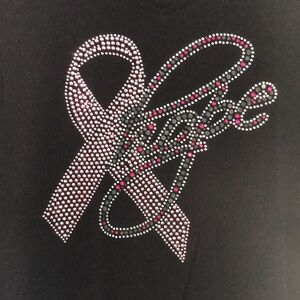 Black v-neck t-shirt marked 2x but it is really like a 10/12 large. Stretchy! Great condition but label is worn away so I can’t read material- it is a blend- not all cotton, quality t. I’d yourself as BC victim/survivor and get a surprise with the shirt 😘