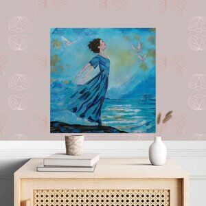 Keywords: freedom painting, woman by the sea artwork, seascape with birds, dove painting, turquoise abstract realism, ocean waves art, spiritual painting of renewal, empowerment wall art, inspirational art, healing artwork, modern romantic realism, ocean and sky painting, symbolic bird art, dreamy abstract realism.