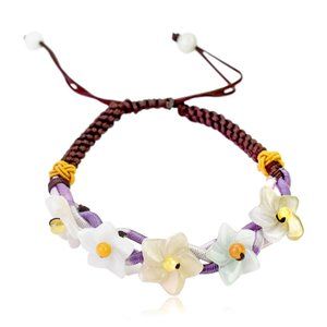 Finish off your spring and summer attire with the Breath of Heaven Flower - 5 Flowers Jade Adjustable Charm Bracelet. This bracelet boasts a braided dusty pink bracelet cord that uses purple and pink loops to connect the five floral pendants to the bracelet. They are carved by hand out of authentic jade.