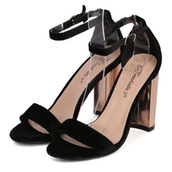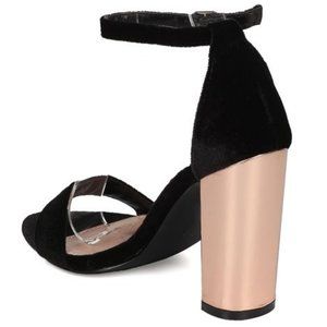 Breckelles Open Toe Velvet Ankle Strap Chunky Metallic Heels