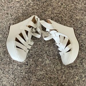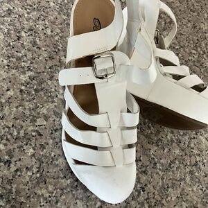 The Breckelles White Wedge Sandals in size 8 1/2 are a stylish and comfortable choice for casual occasions. With a solid white color and a high block heel, these sandals are trendy and trendy. The buckle closure adds a secure fit, while the faux leather upper material ensures durability. Perfect for women looking to add a touch of sophistication to their outfit, these platform and wedge sandals from Breckelles are sure to elevate any ensemble.