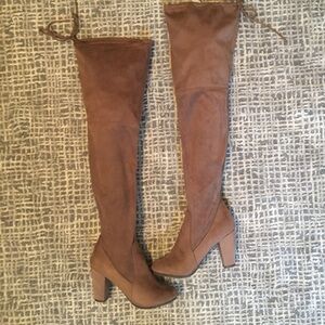 Excellent Used Condition worn just one time these over the knee boots are made with a faux suede , almond toe,chunky heels,side zipper ,drawstrings at top of boots for a great fit, heel 3 3/4”. Please feel free to ask any question,bundle welcome, I can accept offers :)