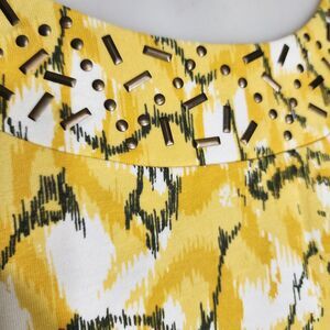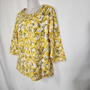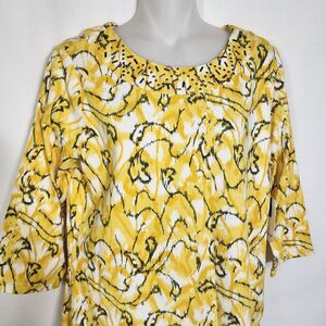 Breckenridge Petite Womens Top Size PM Yellow Black Embellished Neck 3/4 Sleeve