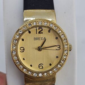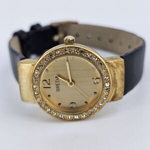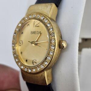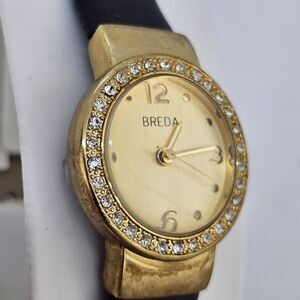 Breda Women's Watch 26MM Gold Dial Crystal Bezel Black Leather Bands New Battery