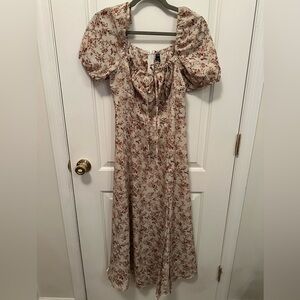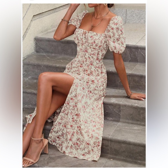 Embrace elegance with this floral puff sleeve dress. The delicate pink and cream hues create a timeless look. Perfect for any occasion.
