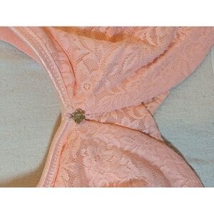 Like new condition, no flaws noted. Delicate and supportive intimates, featuring a Breezies full-coverage bra in a soft pink lace design. This bra offers complete coverage and a natural shape, providing comfort and confidence all day long. Designed with adjustable straps and a secure back closure for a customized fit.