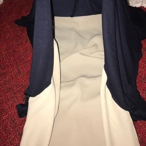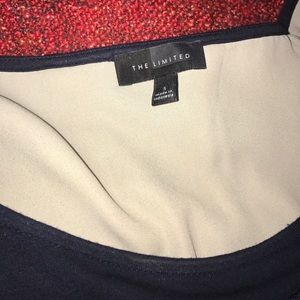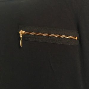 The limited navy blue top with sheer tan back. Front is normal and back is low so will cover your seat if you're wearing leggings. Gold zipper detail is not a functional pocket. So cute and comfy for casual wear.