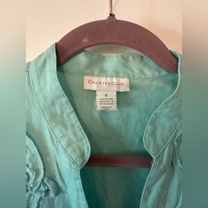This Charter Club shirt is a breezy, coastal-inspired piece in a soft, refreshing turquoise. It’s made of **100% linen**, which gives it that naturally textured, breathable feel—perfect for warmer days. The standout feature is the **white floral embroidery** that runs symmetrically down the front, adding an elegant, handcrafted look without being too fussy.
