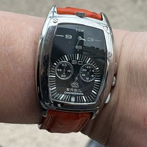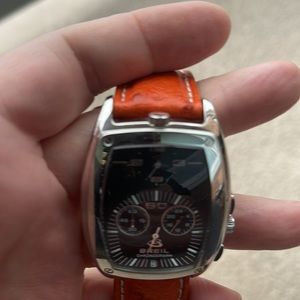 Breil Dual Time Chronograph WatchStainless steel case, Orange Ostrich leather strapoverall condition is very good.unmarked sapphire crystal glass; the case has a few minor surface marks that could be poilished out and strap has no marks or tears - no box