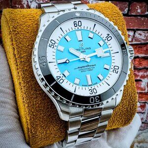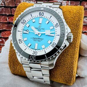 Offered by NoVA Watch Supply of Fairfax, VA: A Pre-Owned Breitling Superocean Automatic 44mm REF. A17376211L2A1, Circa 2023. This eye-popping turquoise dial is arguably the most popular dial color on the new Superocean and that’s not at all surprising as its the perfect color whether you’re spending your day on the boat, at the beach, or even in the boardroom. Extremely versatile, this turquoise dial stunner can brighten even the sunniest days and loves a day on the water with a whopping 100 bar tolerance, but the mixed finish bracelet gives it a dressier look that pairs just as good with a business suit if you’re not enjoying a day in your wet suit. This piece comes with the following: