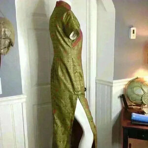 Brenda Fashion lined Chinese inspired Dress; Maxi. Back zipper and snaps. Small! Very petite Asian Kimono/Dress. Shoulder-shoulder: 15.5", Pit-Pit: 18", 41" length, Waist: 16.5” (33) No visible signs of wear though this is a vintage dress. UNIQUE AND RARE