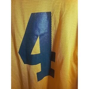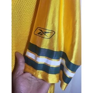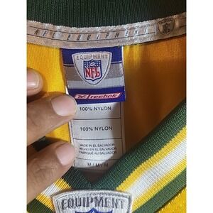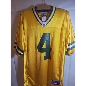 The product is a Reebok #4 Brett Favre Green Bay Packers football jersey in men's medium size and yellow color. This officially licensed jersey is perfect for fans of the National Football League and the Green Bay Packers. The jersey is designed for the regular season and is suitable for both men and women. It is a great addition to any Packers fan's collection, especially for those who admire Brett Favre and his time with the team. Ideal for game days or showing support during the Super Bowl or other NFL events.