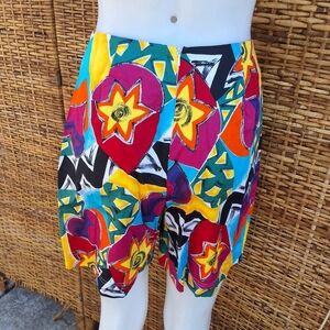 Vibrant FAUX wrap skort with floral patterns. Features red, yellow, blue, and green colors.