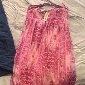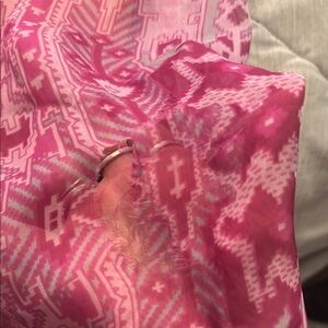 What a stunner for your next vacation! Made out of 100% silk marked as a size large in the color of Aztec pink in the style of sunset, this Brette Sandler VS swimwear is your next go to for relaxing by the beach or even at a dinner! A minor flaw near the hem of the dress I think could be fixed however, I don’t have the skills nor the tools to fix it. Price has reflected this. This does have a bone structure on each of the sides of the bust for extra support. However, it only measures 15 inches across for the best so marking this as a size large I would be very careful of making sure your bust will fit. Seems more like a medium size to me, however it’s supposed to fit tight. Otherwise, this is very flowy with a side zip on the left and a beautiful crochet peekaboo in the front of the neck bust area. This measures 49 inches long with the overlay peeking through stunning print in pale pink, fuchsia and almost a mint green, with the crochet additives in a plum purple! Retails for 216, and is a great option for your next resort trip!