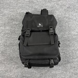 Item: Rucksack-style camera backpack in black with flap top and dual quick-release buckle straps; front deer logo patch.