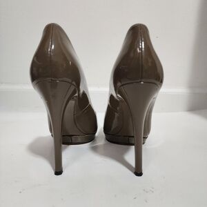 Brian Artwood Brown Taupe Patent Leather Platform Pumps Heels Shoes. Slip on, leather Upper, lining, and sole.