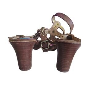 Brian Atwood Blaise Gold Stud Gladiator Sandals in Brown. Size 7. Features open toe, block heels, leather upper, gold-tone studded accents, and ankle buckle closure. Excellent pre-owned condition.