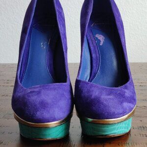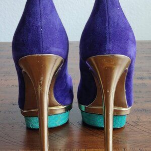 Brian Atwood Fontanne pumps in purple suede with teal snakeskin and gold platform and a golden heel.