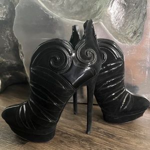 Brian Atwood Figara platform booties. Black suede with patent swirls. Size 38.5