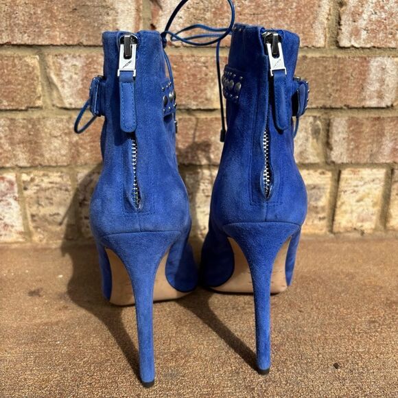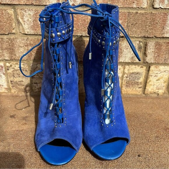 Brian Atwood Cobalt Blue Suede Leather Stiletto Peep Toe Lace Up Boots Size 10
