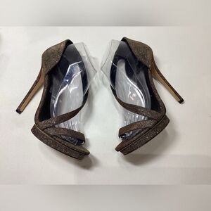 Elevate your style with these glamorous bronze glitter heels! Featuring a sleek stiletto heel, open toe design, and clear vinyl sides for a modern, chic look.