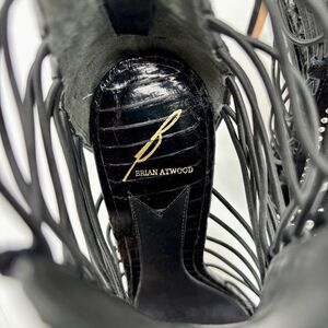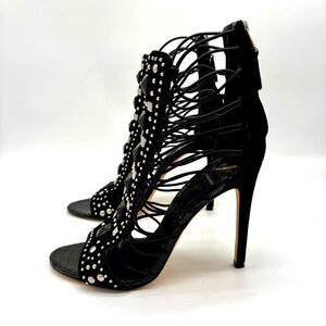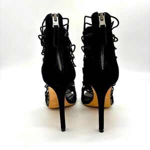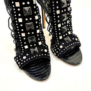 Black suede and python leather with silver metal and python studs. Looped stretch cords at sides. Rear zip. 4.5 inch suede covered heel. Padded python leather insole. Leather outsole.