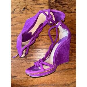 Brian Atwood Priscilla purple leather suede wedge heels size 7.5 women zip back ankle strappy peep toe colorful footbed shows pre owned use split in purple cording and rub wear on sides of cords please see photos