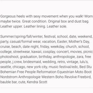 Gorgeous heels with sexy movement when you walk! Worn maybe twice. Great condition. Original box and dust bag Leather upper. Leather lining. Leather sole.