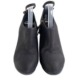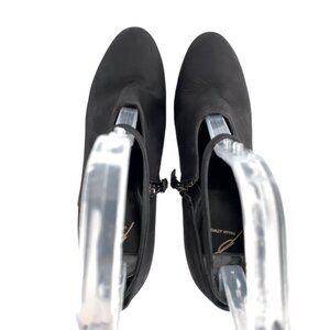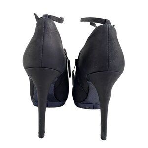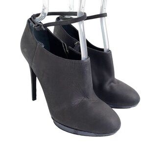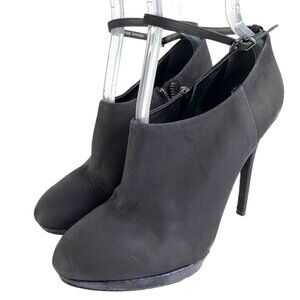 Brian Atwood BFFruiteria ankle booties, black leather with a snake print platform, wrap around ankle strap, 4.75" high heel, size 8.5, preowned and shows wear on the soles, scuffing on the exterior - see photos