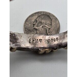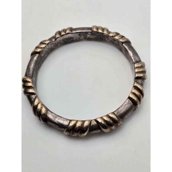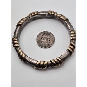 This gorgeous vintage designer artisan modernist style sterling silver & gold plating bangle bracelet has a criss-cross electroform design. Created by Brian Bergner. It measures approx. 9" inches in circumference and 3" interior width. It weighs 21.13 grams and is signed BRIAN 925. Please bear in mind this is a previously owned and loved vintage treasure which shows signs of wear. Please inspect all photos prior to purchase.