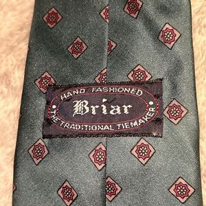 This is a classic Briar men's tie in a handsome dark green with a red and light green geometric pattern. It is crafted from 100% silk. This tie is in excellent condition with no visible stains, snags, or fraying. It measures approximately 57 inches in length and 3.5 inches in width at the widest point. A perfect addition to any discerning gentleman's wardrobe!