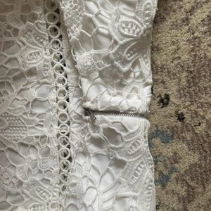 Worn once by person I purchased from. Light staining from makeup on inside seam of the top back of the dress. Cannot be seen when worn, was not disclosed when I purchased it. Dress is clean.