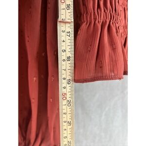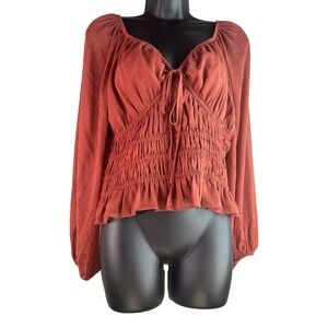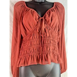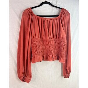 Brick Red Sheer Peasant Top Blouse Women's Smocked Crop Size L