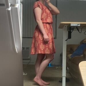 Lauren Conrad pale burnt sienna and pinky-brick red patterned dress.