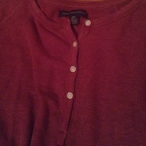 Very soft and barely worn. Has buttons on front and sleeves that are a little tighter around the wrists.