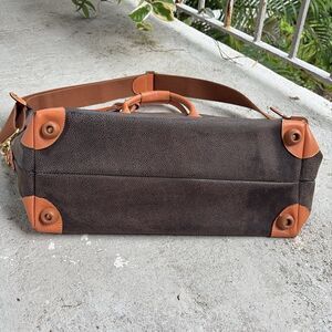 Please look at the pictures as you see the bag itself has some rubbing on it where the color has come off. It’s kind of like a khaki green with blackunderlining color. The strap and shoulder strap are perfect. The base corners show some wear, inside is spotless. Measuring across the bottom is 16.25 x 14 x 6.5, measuring across the top is 23. Strap is adjustable.