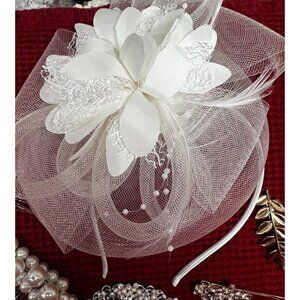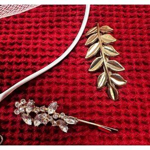 This elegant bridal hair accessories set includes pearl and crystal combs, a classy white fascinator, and a chic gold leaf clip, ideal for weddings.