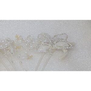Elegant bridal hair combs featuring intricate beaded floral designs with pearl accents, perfect for adding a touch of sophistication to wedding hairstyles.