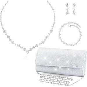 Necklace Length: 19 inches. Earrings Size: 0.3 x 1.2 inches. Bracelet Length: 6-8 inches. Lightweight and comfortable to wear. The clutch purse measures 8 x 4 x 2 inches, large enough to hold your mobile phone, lipstick, eyeshadow, small mirror, change, keys, and more. The press button allows for easy and direct access to the contents of the bag. There is a long detachable chain, enabling this bag to be worn as a crossbody, shoulder bag, or tote bag, providing versatility and convenience.