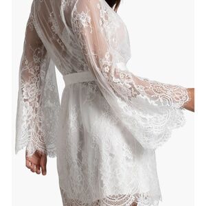 Sheer we lace wrap complete with elegantly scalloped trim and a satin belt that ties at the waist.