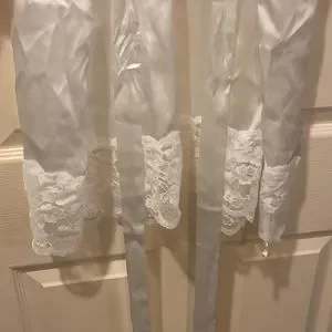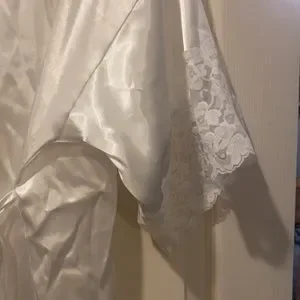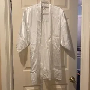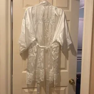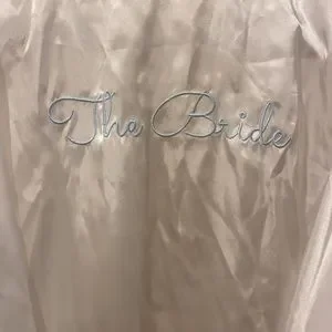 Beautiful white bridal robe with “The Bride” embroidered on the back in blue / size S/P / worn once over a dress while getting hair done - no damage / will steam before sending