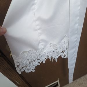 Crisp white bridal robe. Never worn, beautiful flower decals around base or sleeves and hem. Privacy tie inside and robe wrap outside. I also have a pink one that was never worn. Would be a perfect addition for a mom or MOH.