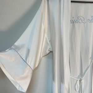Never worn- white satin robe & pale blue “the bride” embroidered on the back