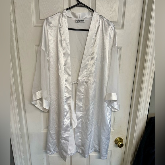 Beautiful bridal robe with sheer sleeves, would be great for day of photos or even special photos for the groom! (Measurements 27 1/2” long) robe does have pockets!